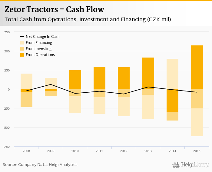 Cash from financing amounted to CZK -366 mil, so the company generated CZK -41.6 mil net cash in 2015.