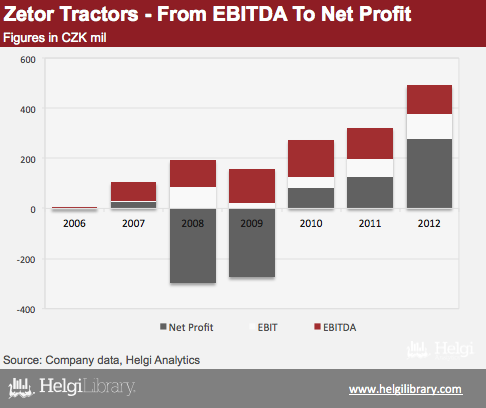 Zetor has achieved total sales of CZK 3.84 bil in 2012, 13% less than in 2007. Compared to the record year 2007 when more than 7,000 vehicles have been sold, "only" 4,929 tractors have been produced in 2012.