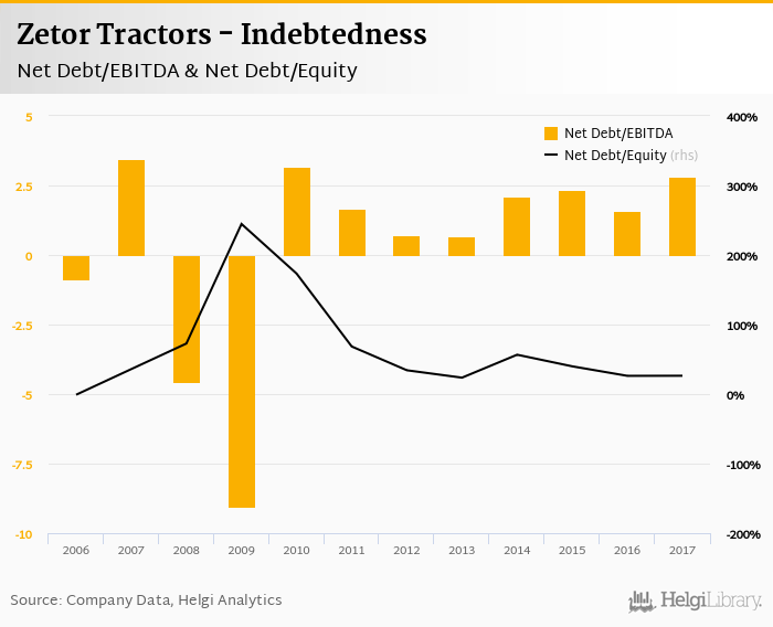 Zetor Tractors's net debt stood at CZK 361 mil and accounted for 26.4% of equity at the end of 2017. The ratio is up 0.141 pp compared to the previous year.