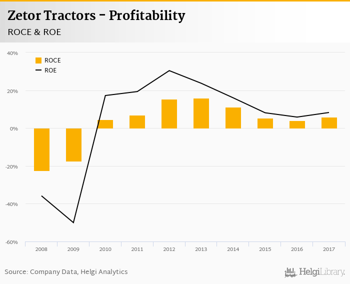 As far as Zetor Tractors's peers are concerned, Tatra Trucks generated ROE of 22.6% and ROCE of 12.7% in 2017. Iveco Czech Republic's profitability reached 25.5% and 22.9%, respectively. Skoda Auto operated with 25.0% and 32.8% returns in 2017.