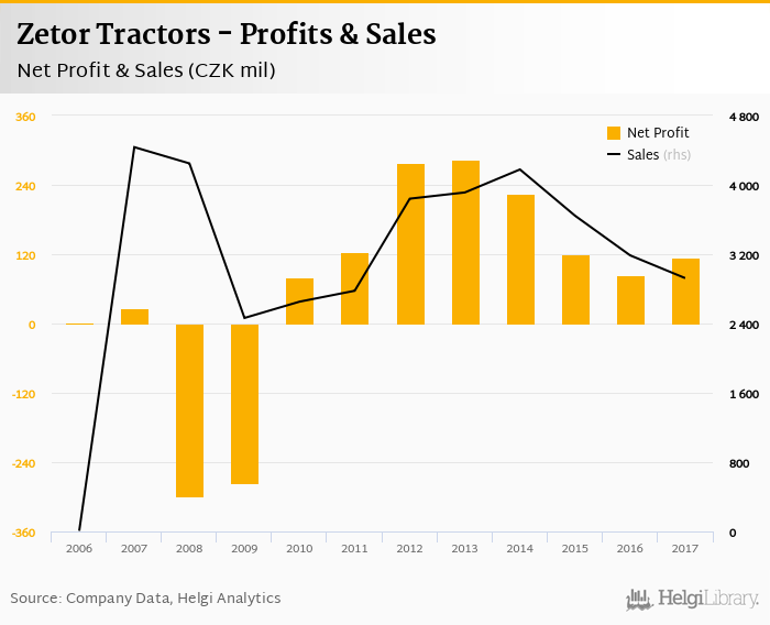 As far as Zetor Tractors's peers are concerned, Tatra Trucks posted a net profit and sales of CZK 561 mil and CZK 6,293 mil in 2017, Iveco Czech Republic generated a net profit of CZK 2,185 mil (with sales of CZK 21,696 mil), and Skoda Auto netted USD CZK 31,841 mil (sales of CZK 407,400 mil).