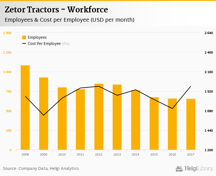 Zetor Tractors employed 655 employees in 2017, down 0.607% compared to the previous year. Historically, between 2008 and 2017, the firm's workforce hit a high of 1,084 employees in 2008 and a low of 655 employees in 2017.