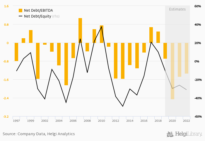 Historically, the firm’s net debt to equity reached a high of 473% in 1994 and a low of -49.2% in 2013 between 1994 and 2019. The average for the last five years was -6.76%.