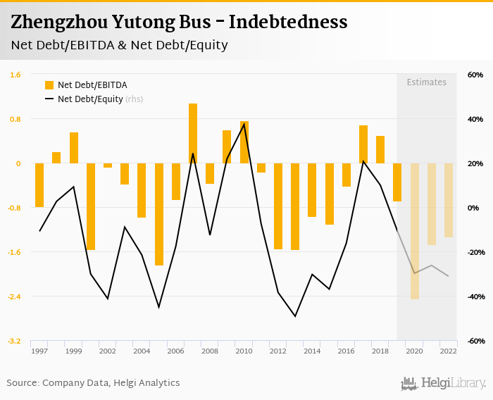 Zhengzhou Yutong Bus's net debt stood at CNY -1,915 mil and accounted for -10.8% of equity at the end of 2019. The ratio is down 20.7 pp compared to the previous year.