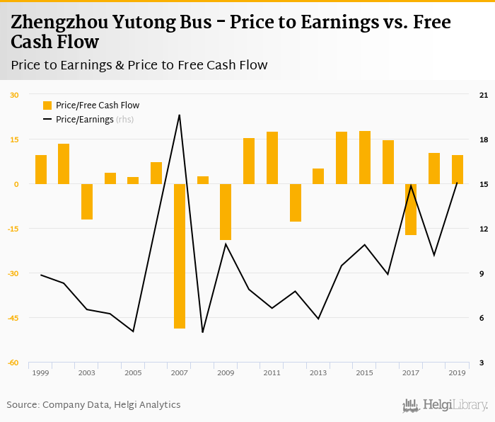 Regarding cash generated defined by the sum of net profit and depreciation, the stock traded at 11.3x at the end of 2019. When investments are excluded to get free cash flow, Zhengzhou Yutong Bus traded at 9.85x.