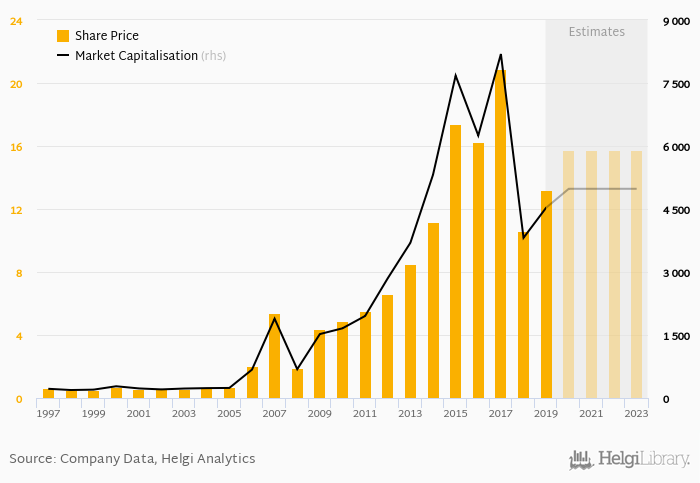 Since the end of 2014, stock has appreciated by 18.3% implying an annual average growth of 3.42% In absolute terms, the value of the company fell by USD 784 mil.