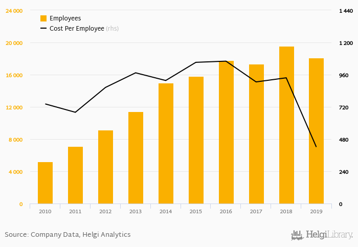 Staff cost represented 2.07% of sales in 2019, 2.07 pp higher than a decade ago.