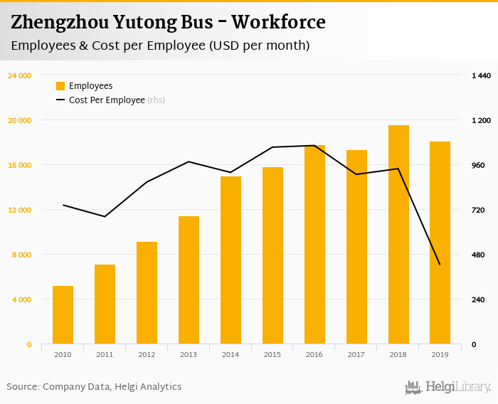 Zhengzhou Yutong Bus employed 18,082 employees in 2019, down 7.4% compared to the previous year. Historically, between 2000 and 2019, the firm's workforce hit a high of 19,757 employees in 2004 and a low of 2,010 employees in 2000.
