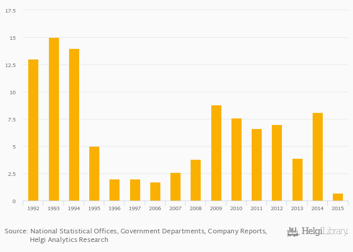 Zinc (slab) production fell 91.4% to 0.700 kt in Ukraine in 2015, according to the National Statistical Office.