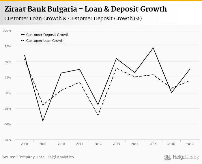 Ziraat Bank Bulgaria's customer loan growth reached 19.3% in 2017, up from 7.20% compared to the previous year. Historically, the bank’s loans growth reached an all time high of 54.0% in 2008 and an all time low of -36.1% in 2012. In the last decade, the average annual loan growth amounted to 0%.