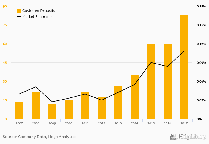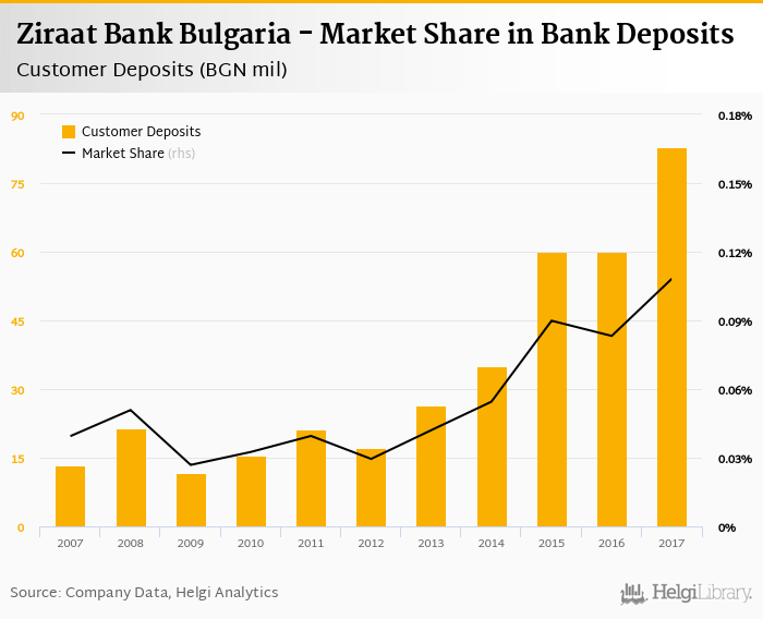 Ziraat Bank Bulgaria accounted for 0.108% of all customer deposits taken by banks in Bulgaria at the end of 2017. Historically, the bank’s market share in customer deposits reached an all time high of 0.108% in 2017 and an all time low of 0.027% in 2009.