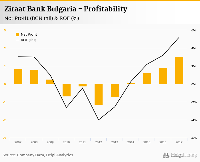 Ziraat Bank Bulgaria made a net profit of BGN 1.51 mil in 2017, up 68.5% compared to the previous year. This implies a return on equity of 5.18%.