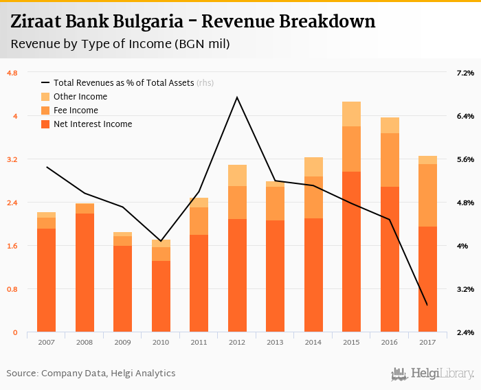 Comparing Ziraat Bank Bulgaria with its closest peers, DSK Bank generated total revenues of 5.78% of assets in 2017, United Bulgarian Bank operated with 4.70% revenue margin and Raiffeisenbank Bulgaria produced total income worth 4.37% of assets.