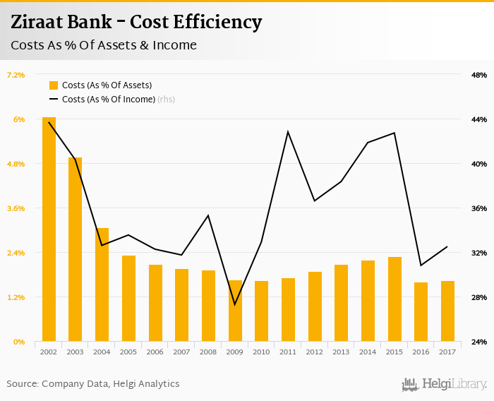 Comparing Ziraat Bank with its closest peers, Isbank operated in 2017 with a cost to income ratio of 54.7% in 2017, Garanti Bank reached 38.8% and VakifBank some 50.5%.