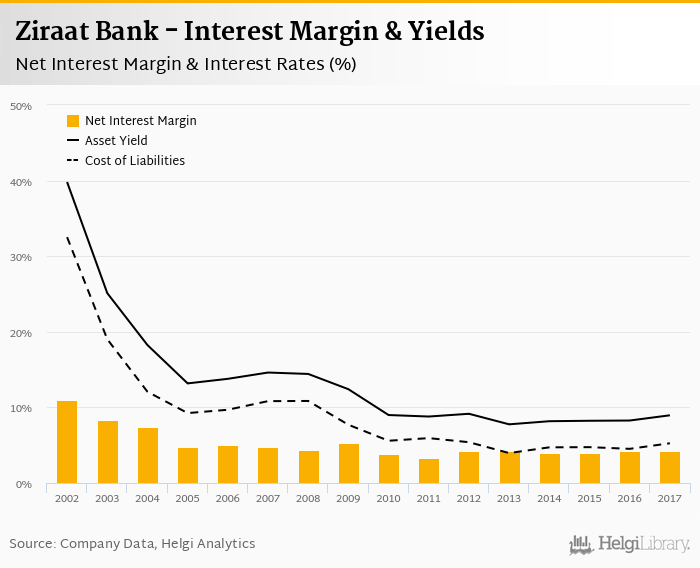 Comparing Ziraat Bank with its closest peers, Isbank operated in 2017 with a net interest margin of 3.70% in 2017, Garanti Bank reached 4.69% and VakifBank some 3.59%.