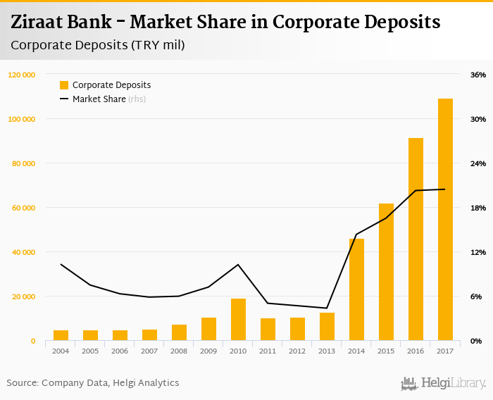 Ziraat Bank accounted for 20.4% of all corporate deposits taken by banks in Turkey at the end of 2017. Historically, the bank’s market share in corporate deposits reached an all time high of 20.4% in 2017 and an all time low of 4.32% in 2013.