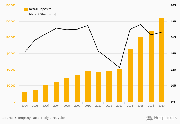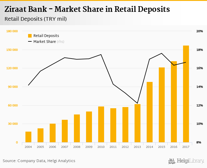 Ziraat Bank accounted for 16.6% of all retail deposits taken by banks in Turkey at the end of 2017. Historically, the bank’s market share in retail deposits reached an all time high of 17.6% in 2015 and an all time low of 12.2% in 2013.