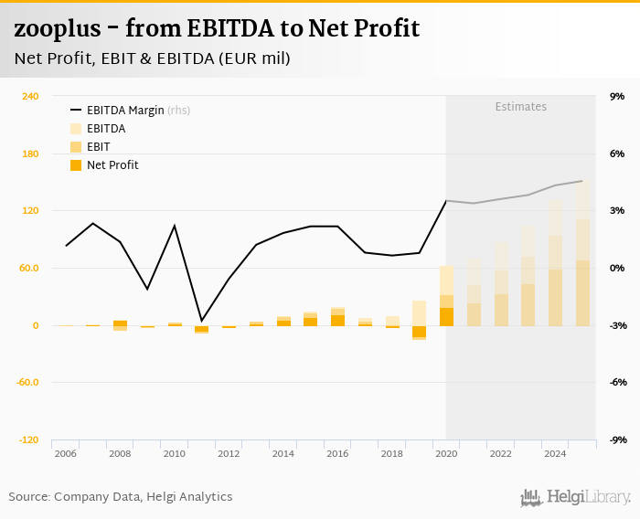 zooplus made a net profit of EUR 18.9 mil with revenues of EUR 1,802 mil in 2020, up by 257% and up by 18.2%, respectively, compared to the previous year. This translates into a net margin of 1.05%.