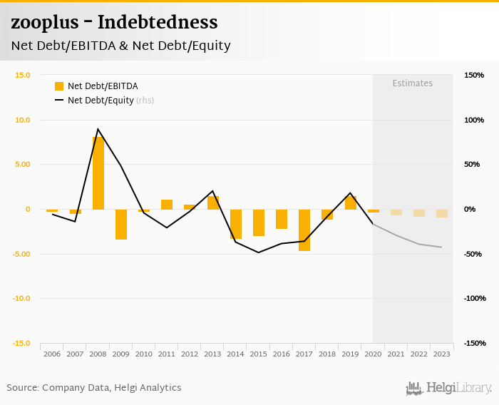 zooplus's net debt stood at EUR -21.1 mil and accounted for -17.0% of equity at the end of 2020. The ratio is down 34.9 pp compared to the previous year.