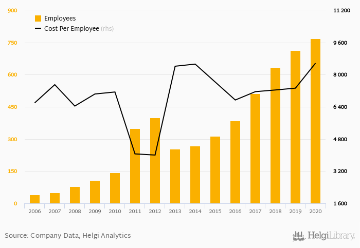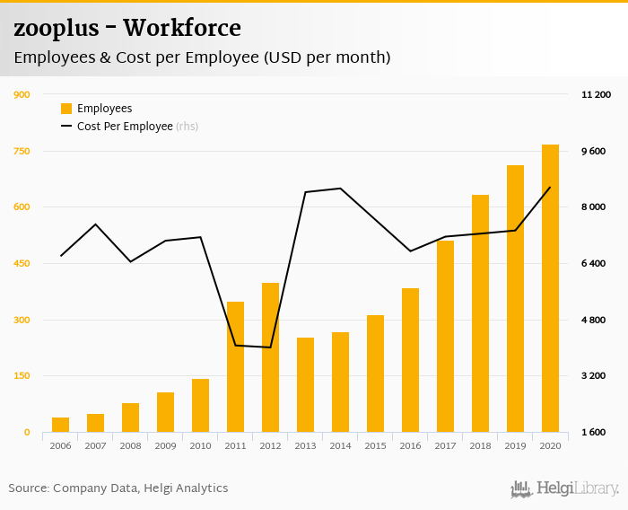 zooplus employed 768 employees in 2020, up 7.71% compared to the previous year. Historically, between 2006 and 2020, the firm's workforce hit a high of 768 employees in 2020 and a low of 40.0 employees in 2006.
