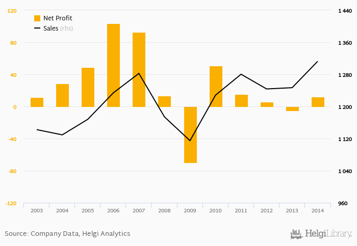 Sales have grown by 1.52% a year on average since 2004. They reached a high of EUR 1,313 mil in 2014 and a low of EUR 1,115 mil in 2009.