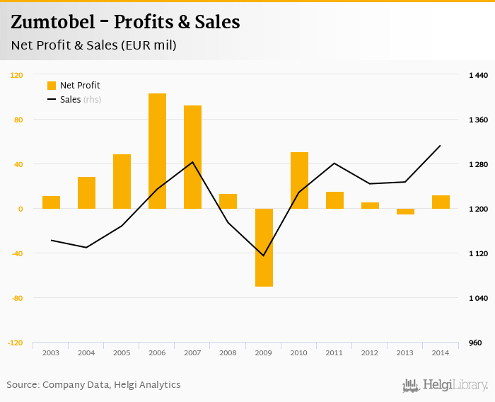 Zumtobel made a net profit of EUR 12.2 mil in 2014, up 345% compared to the previous year. Total sales reached EUR 1,313 mil, which is up 5.28% when compared to the previous year.