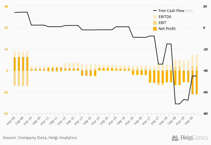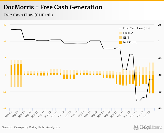 The company generated cash, defined by a sum of net profit and depreciation, of CHF -16.3 mil or -4.76% of sales. When investments are excluded, free cash flow reached CHF -45.3 mil, or -13.2% of sales in 4Q2019.