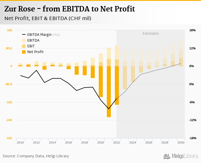 On the operating level, EBITDA reached CHF -77.7 mil, up 45.6% compared to the previous year. Over the last five years, company's EBITDA has risen 29.7% a year on average.