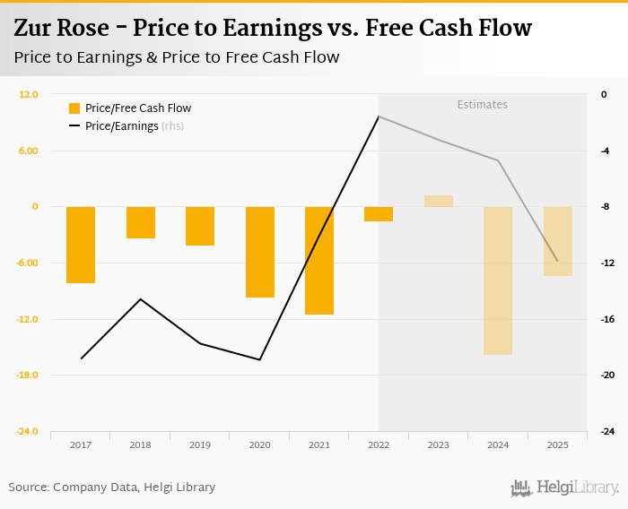 Regarding cash generated defined by the sum of net profit and depreciation, the stock traded at -1.69x at the end of 2022. When investments are excluded to get free cash flow, Zur Rose traded at -1.46x.