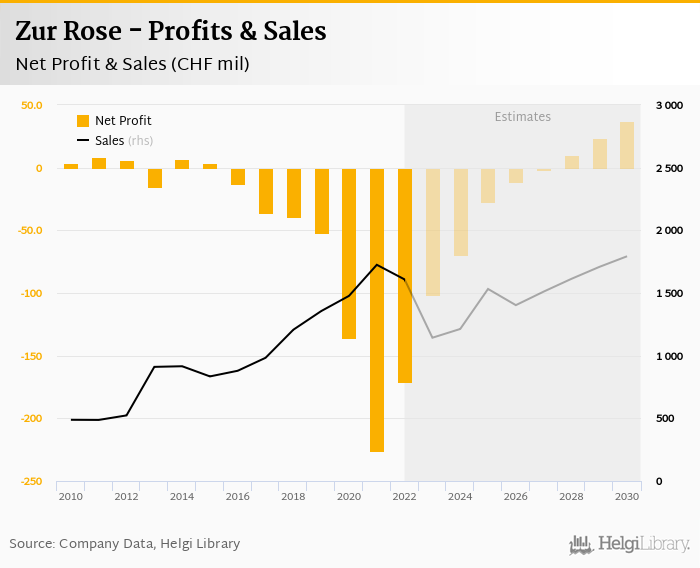 Zur Rose made a net profit of CHF -171 mil in 2022, up 24.2% compared to the previous year. Total sales reached CHF 1,608 mil, which is down 6.77% when compared to the previous year.