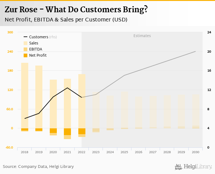 In 2022, Zur Rose served a total of 10.4 mil customers, up 47.0% when compared to 3 years ago. A simple comparison of Zur Rose's sales with a number of its customers reveals that the average customer brought the firm USD 169 revenue in 2022. In terms of profitability, a single client generated EBITDA of USD -8.18 and a net profit of USD -18.0 in 2022.
