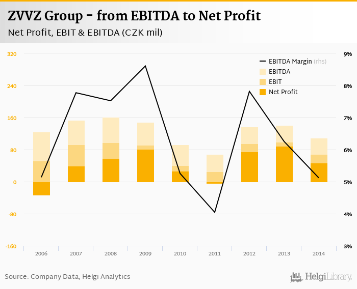 ZVVZ Group made a net profit of CZK 47.0 mil with revenues of CZK 2,126 mil in 2014, down by 47.5% and down by 6.09%, respectively, compared to the previous year. This translates into a net margin of 2.21%.