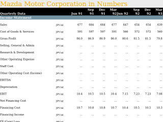 This Quarterly Statistical Dossier offers a summary of Mazda Motor Corporation's performance between Jun 91 and Jun 20 on an quarterly basis. The report can be downloaded as an Excel file.